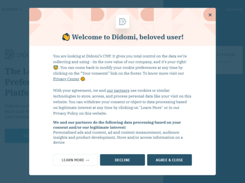 Place customer consent at the core of your strategy Didomi builds technology to help companies put their users in control of their personal data. By doing so, they generate valuable trust and lay the groundwork for privacy-conscious growth. Schedule a demo Our consent & preference mana...