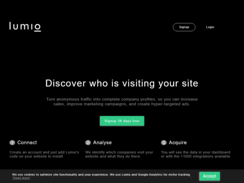 Discover who is visiting your site Turn anonymous traffic into complete company profiles, so you can increase sales, improve marketing campaigns, and create hyper-targeted ads. Signup 30 days free 1 Connect Create an account and just add Lumio's code on your website to install. 2 Anal...