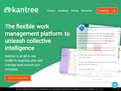The flexible work management platform to unleash collective intelligence Kantree is an all-in-one toolkit to organize, plan and manage work across your company Discover how Kantree can help your team Our visual & flexible collaboration platform transforms work across your company. W...
