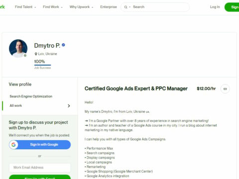 Hello! My name's Dmitriy, I'm from Lviv, Ukraine. ➜ I'm a Google Partner with over 8 years of experience in search engine marketing! ➜ I'm an author and teacher of a Google Ads course in my city. I run a blog about internet marketing in my native language. I can help you with all types ...