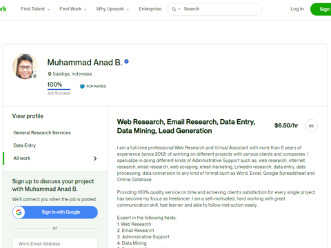I am a full-time professional Web Research and Virtual Assistant with more than 6 years of experience (since 2012) of working on different projects with various clients and companies. I specialize in doing different kinds of Administrative Support such as: web research, internet research, email research, web scraping, email marketing, Linkedin research, data entry, data processing, data conversion to any kind of format such as Word, Excel, Google Spreadsheet and Online Database.