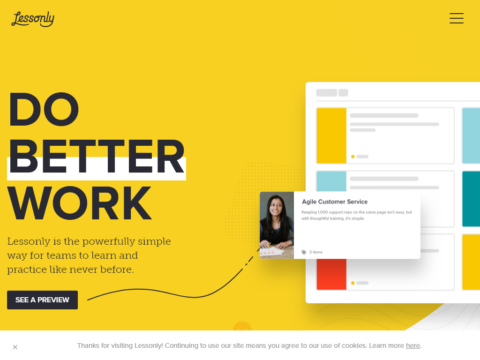 DO BETTER WORK Lessonly is the powerfully simple way for teams to learn and practice like never before. SEE A PREVIEW Trunk Club MeUndies Dun & Bradstreet Goodwill U.S. Cellular SalesLoft Invision JeldWen HelloFresh Jostens McAfee LendingHome Stay ahead of change We're a...