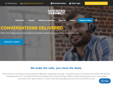 We make the calls, you close the deals. MonsterConnect accelerates lead generation for B2B sales organizations through a consistent stream of live phone connections with decision-making prospects. Our unmatched blend of fast dialing and routing technology, efficient outbound prospecting service,...