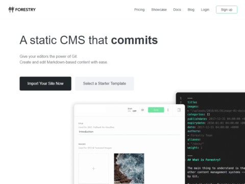 A static CMS that commits Give your editors the power of Git. Create and edit Markdown-based content with ease. Import Your Site Now Your site, your workflow Write front-end code with Gatsby, Hugo, Jekyll or Vuepress and push to your Git repo. Forestry will pull in your commits and update ...