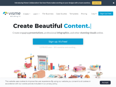 Create Beautiful Content. Presentations. Documents. Infographics. Graphics. Together. Design and share beautiful on-brand presentations, infographics and any other visual communications for you and your team. Visme is a cloud-based visual content creation and collaboration platform, em...