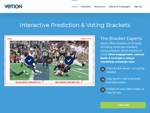Interactive Prediction & Voting Brackets Votion-Bracket-Pats The Bracket Experts Votion offers brackets of all types, including prediction brackets, voting brackets, NCAA brackets & more. Drive engagement, capture leads, & leverage a unique marketing campaign type. Point & c...