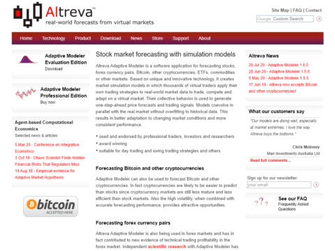Stock market forecasting with simulation models Altreva Adaptive Modeler is a software application for forecasting stocks, forex currency pairs, Bitcoin, other cryptocurrencies, ETFs, commodities or other markets. Based on unique and innovative technology, it creates market simulation models in ...