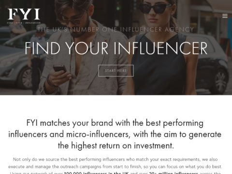 FYI-homepage-header3.jpg LEADING UK INFLUENCER MARKETING AGENCY FIND YOUR INFLUENCER THE UK'S NUMBER ONE INFLUENCER AGENCY FYI matches your brand with the best performing influencers and micro-influencers, with the aim to generate the highest return on investment. Not only do we source t...