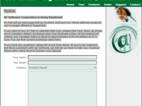 Notice AY Software Corporation is being liquidated AY Mail will be sold/supported by Northern Software Inc. Other software products are no longer offered or supported. If you want to buy AY Mail or upgrade right now, please click here. Note, all prices are in Canadian dollars. Exchange rat...