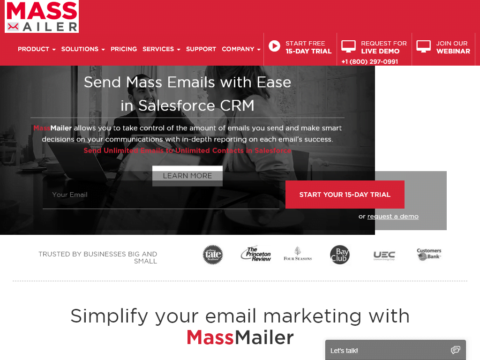 Simplify your email marketing with MassMailer SALESFORCE CAMPAIGNS Send emails to your campaign members, contacts and leads from within Salesforce. SIMPLE EMAIL WIZARD Build, send, and schedule professional-looking emails with a simple to use email Wizard within Salesforce – no HTML exper...