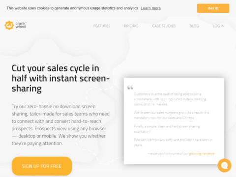 Even though it’s powerful, CrankWheel is still extremely easy-to-use. Your sales team will only need to spend time practicing their pitch; not fumbling around with the screen-sharing tool.