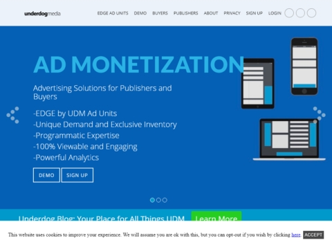 Underdog Media is an innovative ad monetization company serving 100% viewable ad units and solutions. Our EDGE by UDM owned and operated unique ad units run across desktop and mobile driving high-impact viewability, engagement and revenue for publishers and advertisers. It compliments your current monetization strategy, does not interfere with your existing solutions and is engineered to drive results.